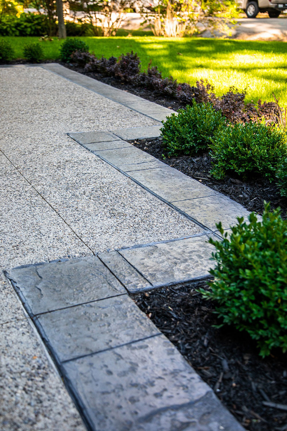 Exposed aggregate concrete is great for the driveway as it provides a certain colour and texture that gives it that unique, modern look over regular concrete. In additional, all decorative concrete done by Markstone Landscaping includes high gloss sealing that always protects concrete from any oil or rust stains. For this driveway, we used exposed aggregate concrete with stamped concrete borders to give it a nice accent with the look of natural store.