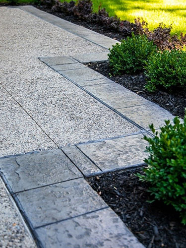 Concrete borders can be a trowel or stamped borders. A trowel finish border is a smooth border created with a trowel, while a stamped border is created by impressing a texture into the border and finishing it with a colour hardener.