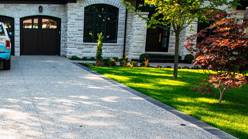 A level up from brushed concrete is Exposed Aggregate Concrete which gives your driveway or backyard patio that added texture. Decorative, stained or stamped concrete are premium finishes that will bring the price higher. These finishes can give the landscape a unique, high-end look.