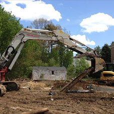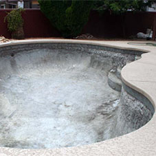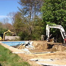 If the pool is still filled with water, an electric pump is used to pump out the water and drained into the city sewer. Holes approximately 6’ x 6’ are punched, one in the deep end and one in the shallow end for proper drainage. Concrete swimming pools require the sides to be broken around 2 feet below ground level while vinyl liners will be cut out, removed and disposed of.